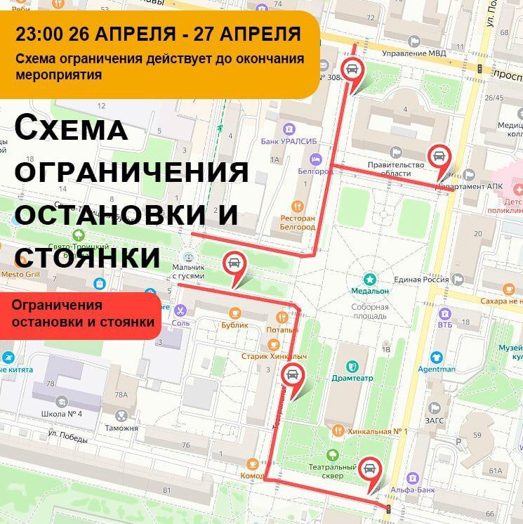 По данным ведомства, временные неудобства возникнут завтра и будут связаны с возложением цветов по случаю годовщины присвоения Белгороду почетного звания «Город воинской славы». 27 апреля с 6:00 и до окончания мероприятий для проезда будут недоступны следующие участки:
