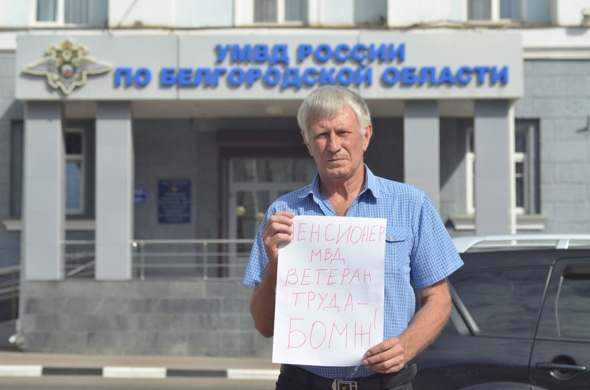 Житель посёлка Разумное Сергей Черныш вышел с одиночным пикетом к УМВД Белгородской области. В руках мужчина держал плакат с надписью «Пенсионер МВД, ветеран труда — бомж».
