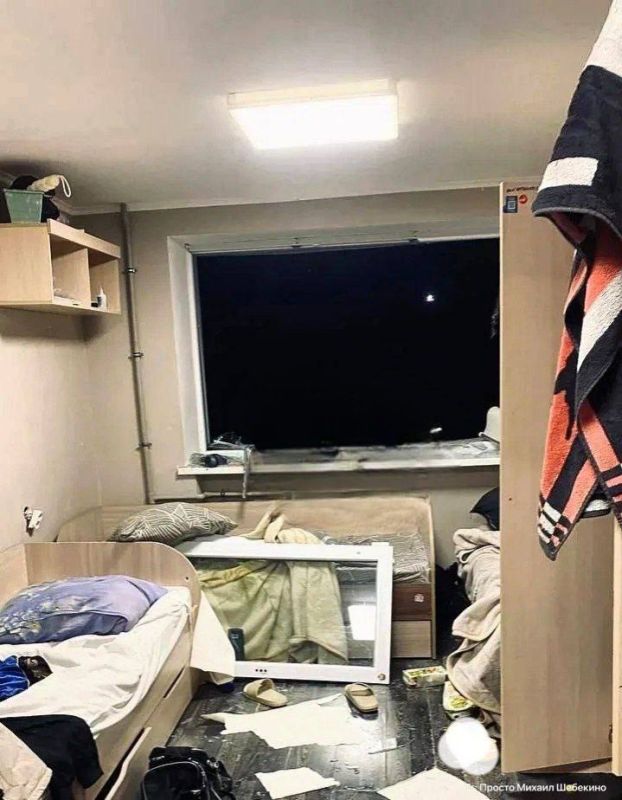 В сети появились кадры из общежития в городе Короча Белгородской области, по которому ударил украинский беспилотник. На фото — выбитые окна, разгромленная мебель, последствия взрыва.