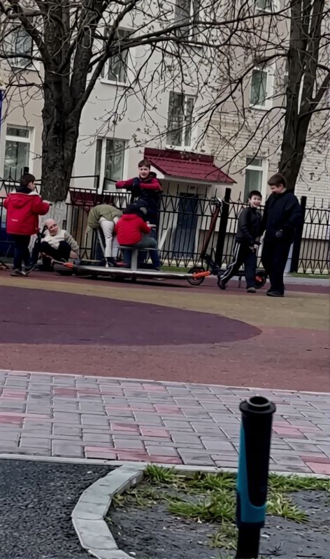 Очевидцы сообщают об инциденте на детской площадке в городе Строитель Белгородской области. Группа несовершеннолетних экстремалов посадила своего знакомого на карусель и раскрутила её с помощью электросамоката.