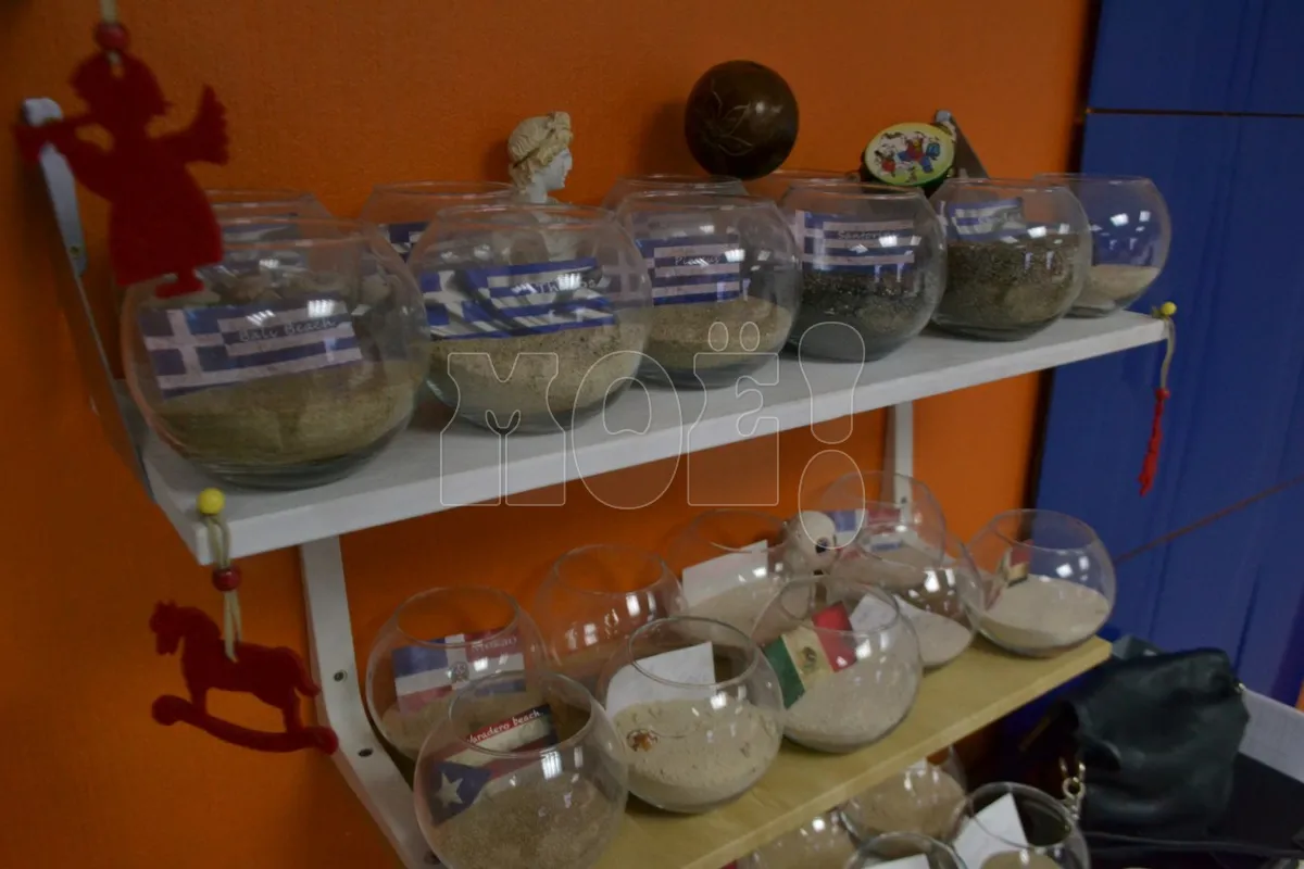 Сейчас на стеллажах разместились 102 образца. Крымская галька, песок Мёртвого моря, такой солёный, что флаг Израиля, вложенный в него, затвердел от соли. В каждом из образцов название пляжа, на котором собрали песок.