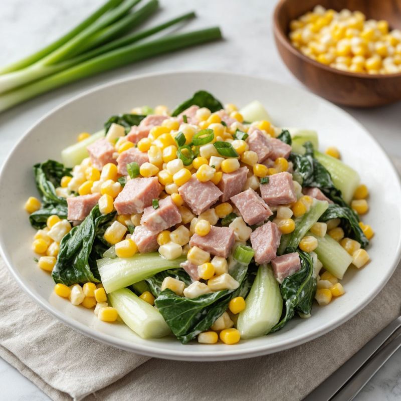 - Нашинкуйте ветчину и огурец. Из кукурузы слейте ненужную жидкость. Лук мелко нарежьте.