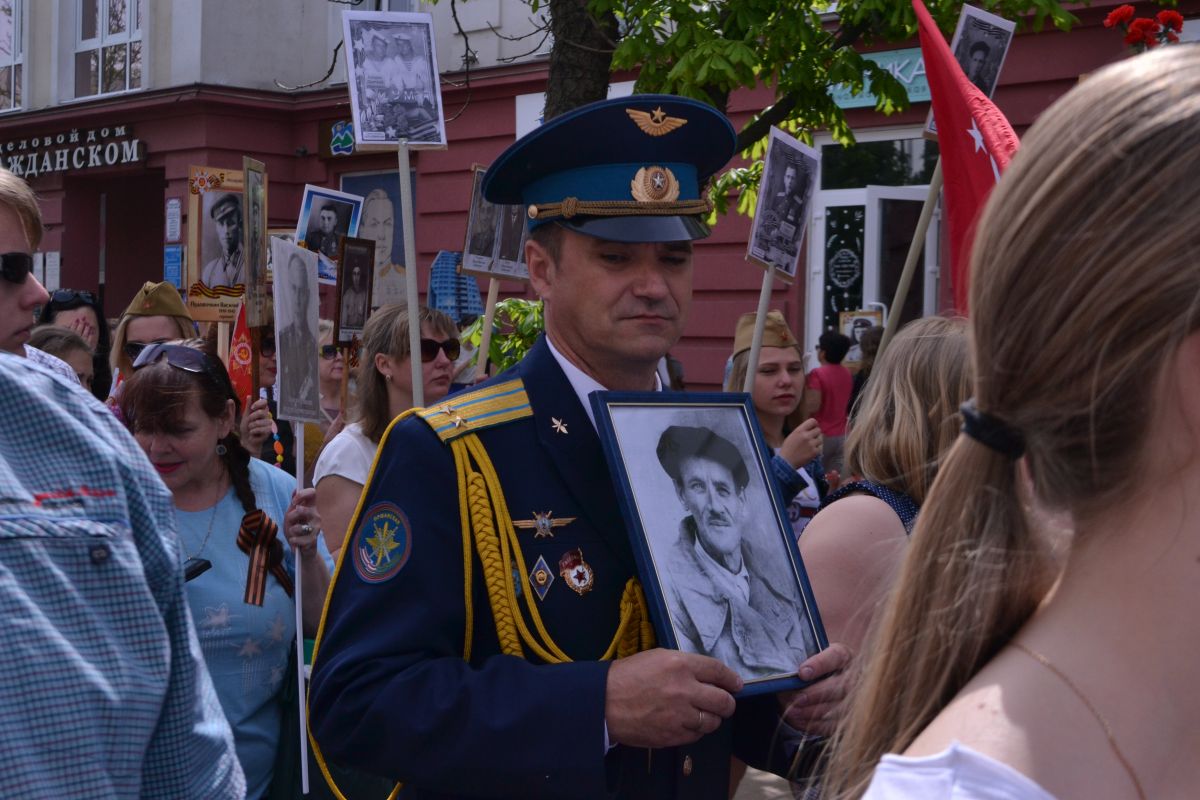 Гражданский проспект от Соборной площади до железнодорожного вокзала был заполнен людьми. Горожане шли с детьми, одетыми в военную форму времён ВОВ, несли плакаты, флаги, награды родных и их портреты. В «Бессмертном полку прошёл и глава региона – Евгений Савченко. Он нёс портрет своего отца, Степана Семёновича Савченко.