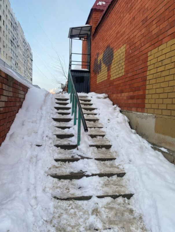 Основная проблема — лестница, ведущая через этот проход. По словам местных жителей, она уже давно не чистится от снега и покрыта толстым слоем наледи. Ступени стали скользкими и практически непроходимыми без риска.