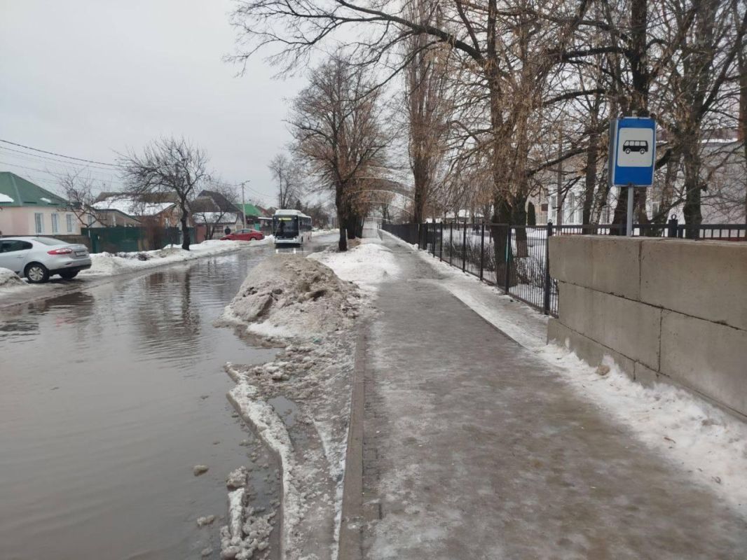 Ученики белгородской школы № 18 вынуждены добираться до занятий по опасному маршруту. Подходы к учебному заведению затопило, а тротуары покрылись льдом.