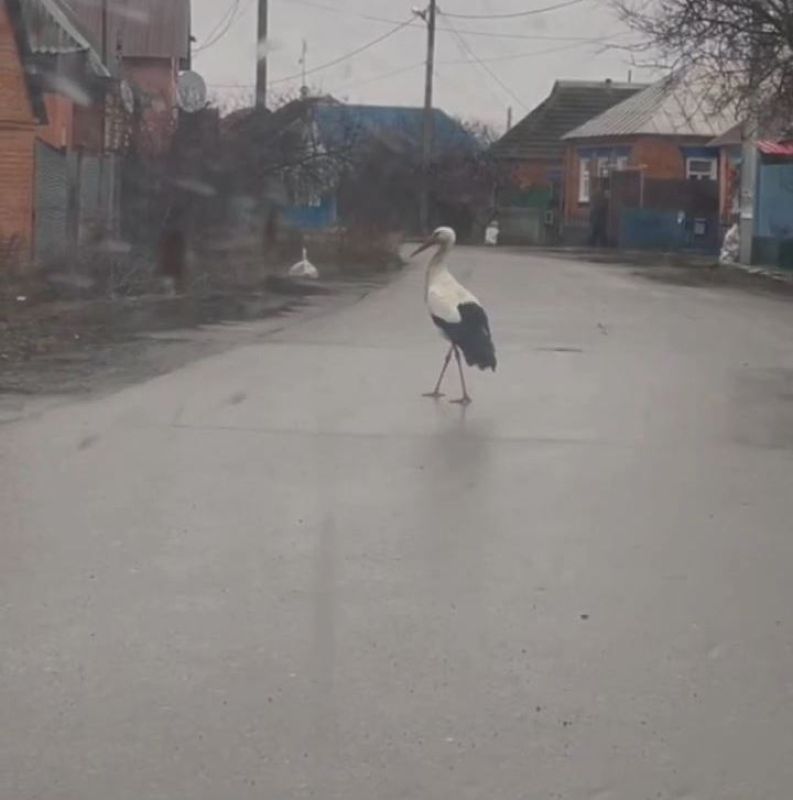 В Шебекино Белгородской области очевидцы засняли необычного пернатого гостя — аист совершенно спокойно разгуливал по дороге между домами в частном секторе, не проявляя страха перед людьми.