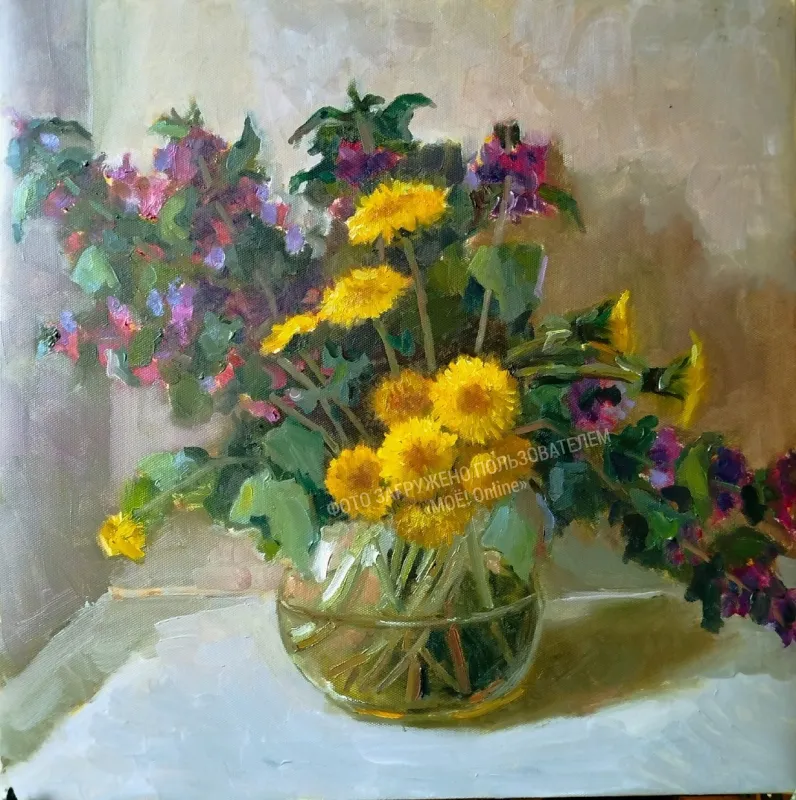 - Хотела написать сирень, но вышла к реке, а там жёлтые одуваны и совершенно бесподобная фиолетовая яснотка! Идеальное сочетание! Ну и все, натюрморт сложился в такую вот работу!