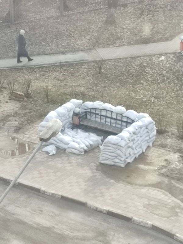 Мешки с песком упали возле лавочки, которую они окружали