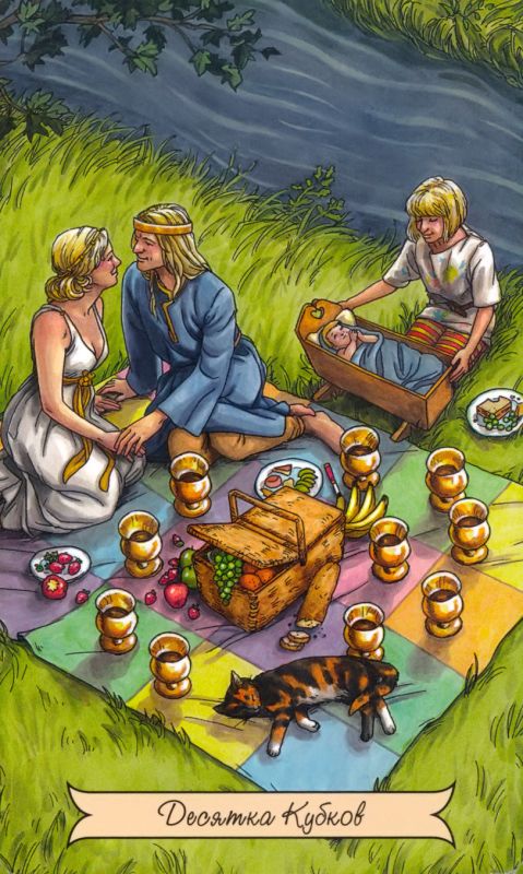 Десятка Кубков прелесть что за карта, просто праздник. 10 кубков — это про счастливую жизнь, уютный дом, гармоничные отношения.