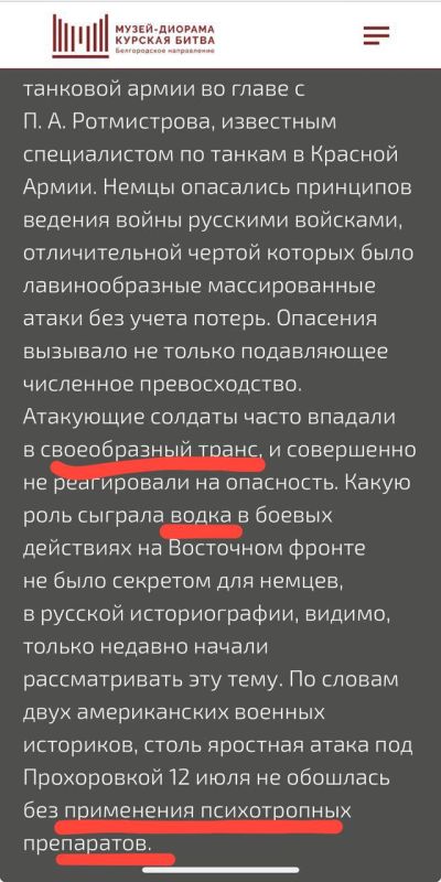 «Самое удивительное — это то, что руководство музея после выхода постов у блогеров не удалило безобразный материал, дискредитирующий подвиг наших ветеранов, и не принесло извинения. Вместо этого они выпустили длинный оправдательный текст и заявили о том, что «проработают вопрос целесообразности публикации данных материалов» после обсуждения с участием «ведущих историков, краеведов и экспертов страны». Серьезно? То есть они собираются обсуждать бредовые тексты о том, что солдаты Красной армии шли в бой под Прохоровкой, выпив «водку» или под воздействием психотропных препаратов, как пишет немец??? Как внучка участника Великой Отечественной Войны я глубоко лично оскорблена публикацией этих материалов и действиями руководства музея. У меня просто нет слов. Я требую публичных извинений и привлечения к ответственности всех должностных лиц музея»,— говорится в сообщении.