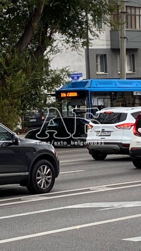 В Белгороде столкнулись автобус и легковушка. Фото и видео с места аварии опубликовал телеграм-канал «Авто Белгород».