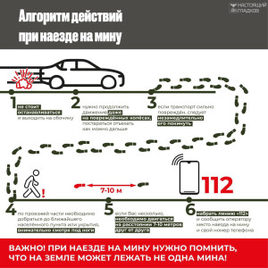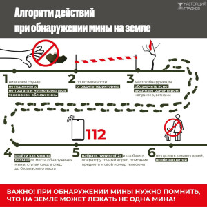 Граждан просят строго соблюдать правила безопасности и не посещать закрытые на въезд населенные пункты. Если вы обнаружили мину в населенном пункте, въезд в который не ограничен, помните главное — боеприпас может быть не один, а аналогичные предметы скорее всего находятся неподалеку. Если вы наехали на мину на машине, постарайтесь продолжить движение и отъехать на безопасное расстояние. Если автомобиль сильно поврежден, покиньте его и по проезжей части, внимательно смотря под ноги, соберитесь до населенного пункта или укрытия. Затем позвоните по номеру 112. Если в момент обнаружения мины рядом с вами находится компания людей, собирайтесь до безопасного сестра по полному и тому же маршруту и держитесь на расстоянии 7 - 10 метров друг от друга.