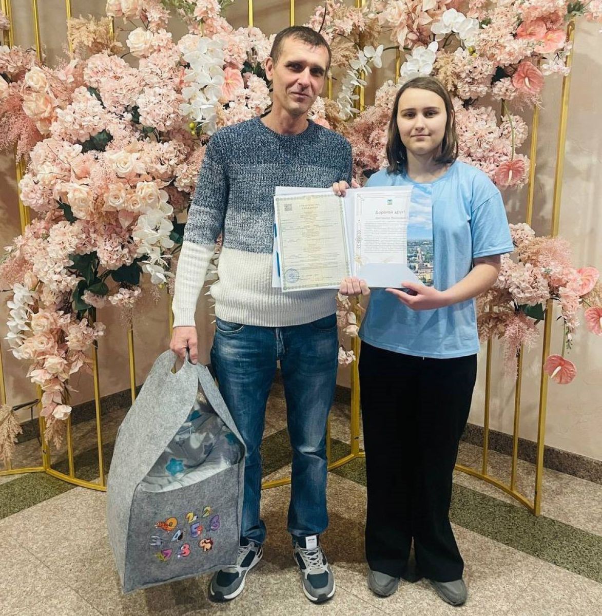 По данным источника, мальчик появился в семье Романа и Натальи Симоненко. Малыша назвали Святославом. Сегодня родителям вручили первые документы мальчика и подарок от правительства.