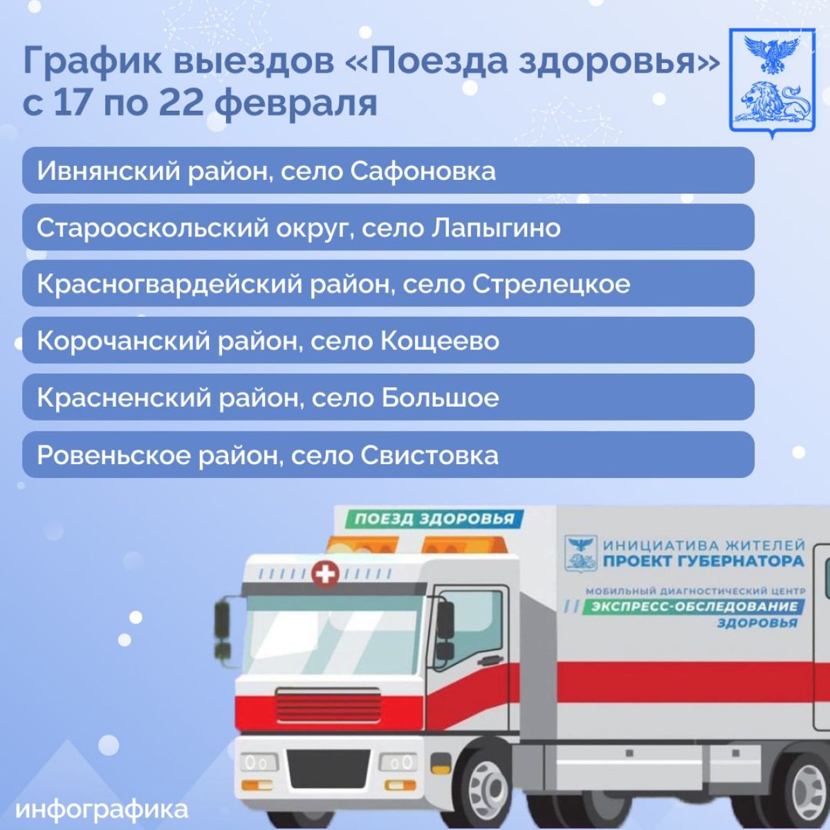 Появился очередной график работы мобильных медицинских комплексов Белгородчины. На текущей неделе, с 17 по 22 февраля, «Поезд здоровья» посетит шесть сёл разных районов области. Это Ивнянский район, село Сафоновка, Старооскольский округ, село Лапыгино, Красногвардейский район, село Стрелецкое, Корочанский район, село Кощеево, Красненский район, село Большое и Ровеньской район, село Свистовка.